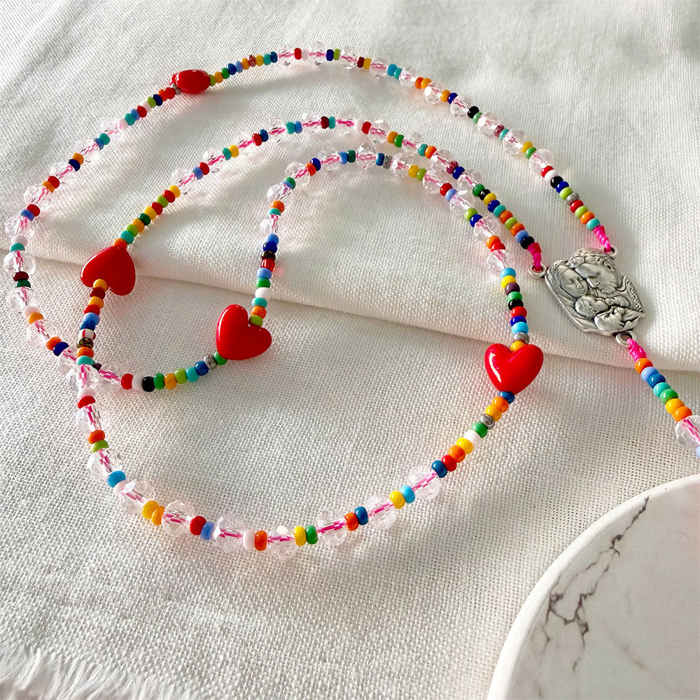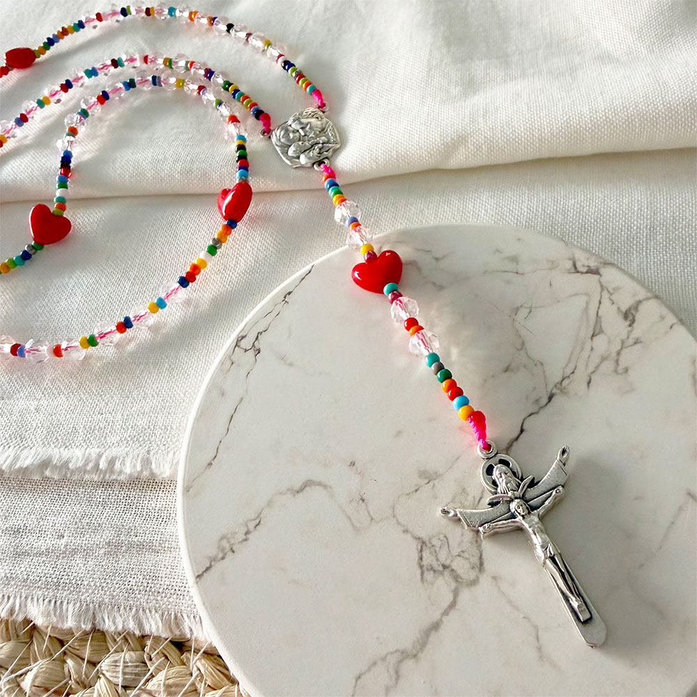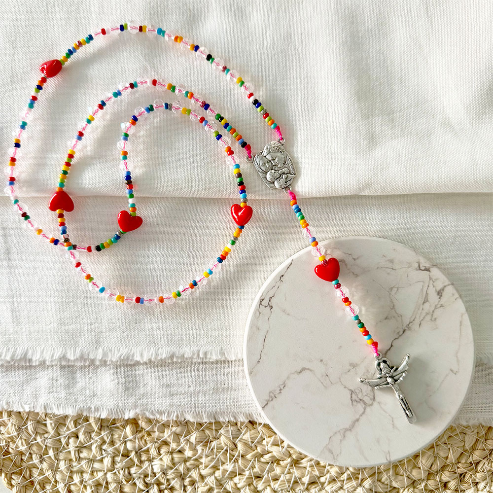 Collar largo, base en micro cordón de seda, cristales facetados de murano transparentes, corazones en acrílico rojo, mix de charquiras checas en diferentes tonos, cruz y crucero de la sagrada familia en zamack italiana.
