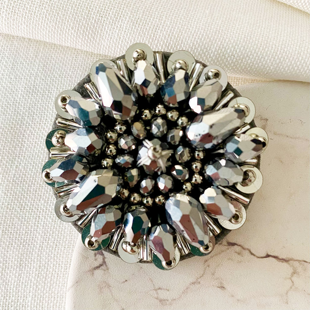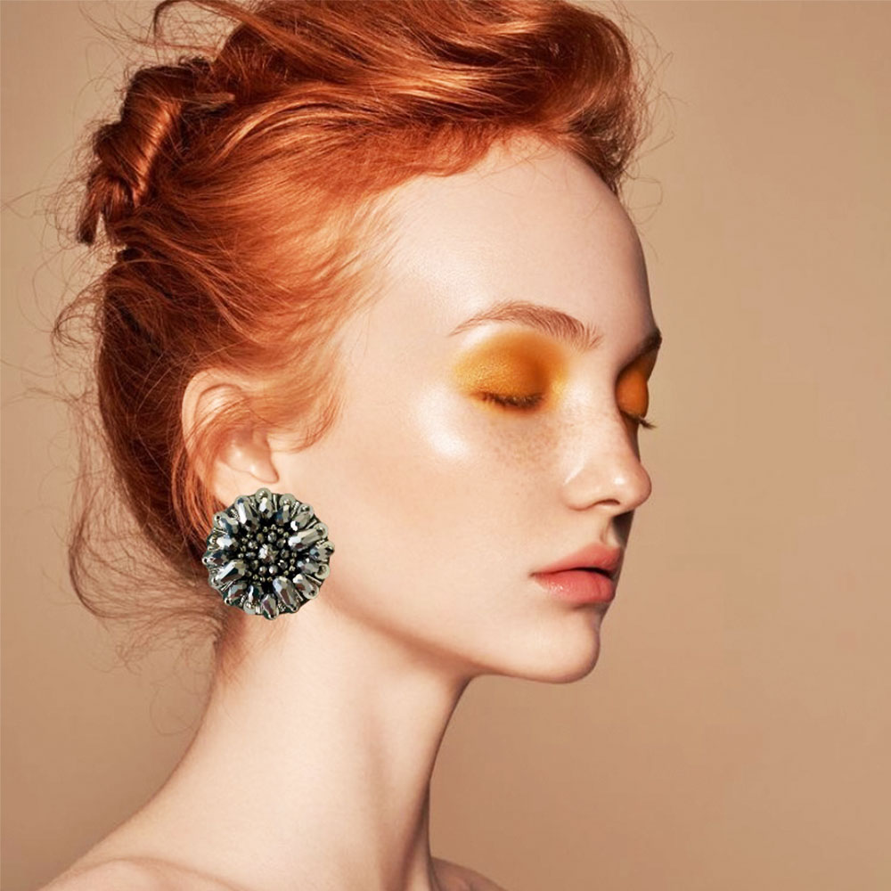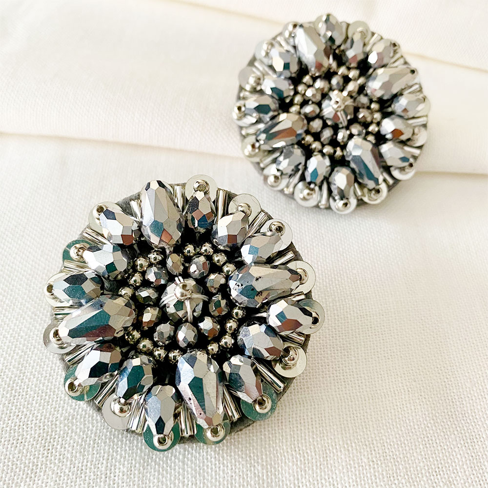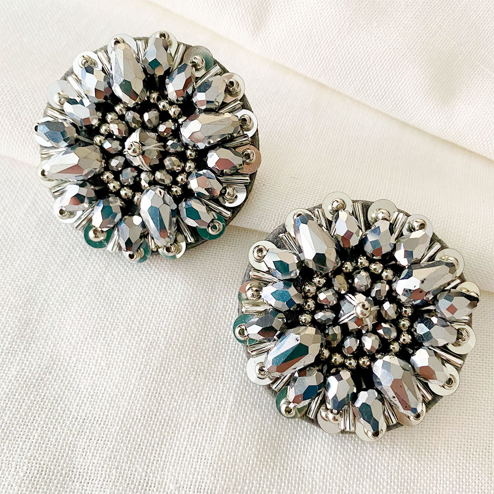 Aretes bordados 100% a mano en mezclas de materias y técnicas, lentejuelas, canutillos, mostacillas, cristales de muranos y vidrios, Base en felpa y sistema de topo con pin en acero plateado.