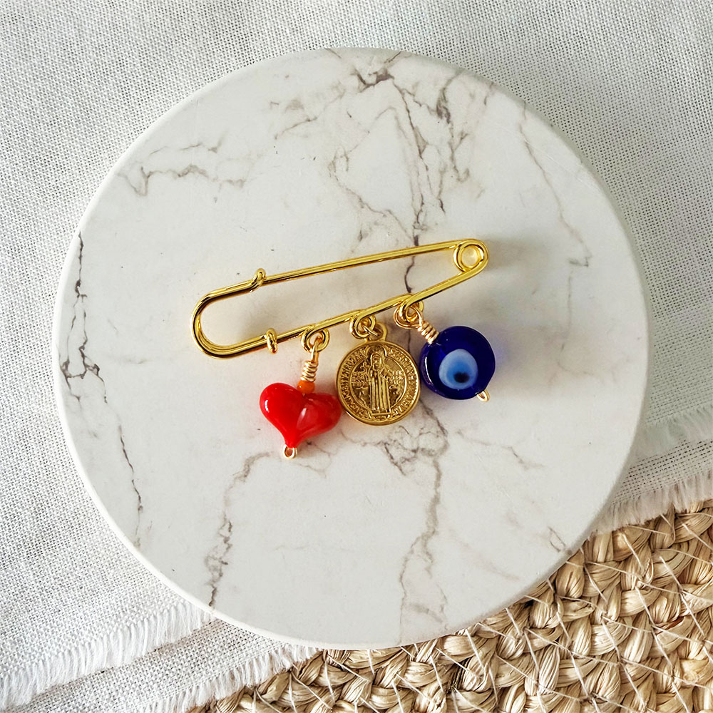 Pin prendedor en forma de gancho con base en bronce con baño en oro y dijes colgantes de la medalla San Benito, corazón rojo y ojo turco. COLECCIÓN: PARTY CHARMS / RELICARIO Cuidados: Para una mayor durabilidad de nuestras piezas, se debe evitar el contacto directo con: Agua de Mar, piscina, cremas, perfumes, alcohol y cualquier tipo de líquidos que puedan deteriorarla. Cada vez que se use se recomienda limpiar con paño suave y seco. A mayor cuidado, mayor durabilidad. Producto hecho 100% a mano en COLOMBIA.