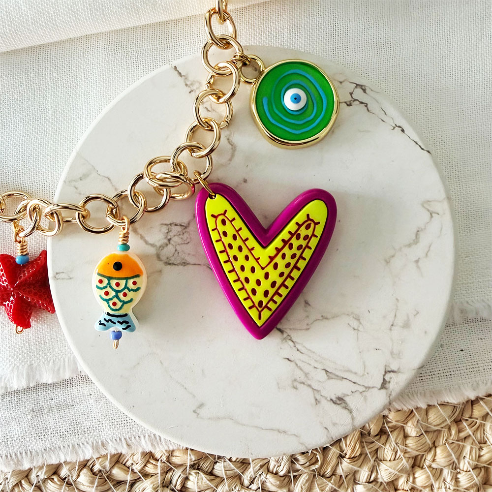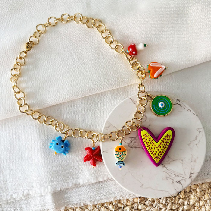 Lo último, Mujer, PulserasPulsera de eslabones en base bronce con baño en oro, mix de dijes diferentes materiales, cristal, murano y bronce con baño en oro de corazón, ojo turco, trébol, azabache, mariquita, hongo, flor y estrella en nácar. MEDIDAS: Estándar, cadena extensión para ajuste. COLECCIÓN: La COSTA. Cuidados: Para una mayor durabilidad de nuestras piezas, se debe evitar el contacto directo con: Agua de Mar, piscina, cremas, perfumes, alcohol y cualquier tipo de líquidos que puedan deteriorarla. Cada vez que se use se recomienda limpiar con paño suave y seco. A mayor cuidado, mayor durabilidad. Producto hecho 100% a mano en Colombia.$65,000.00 -